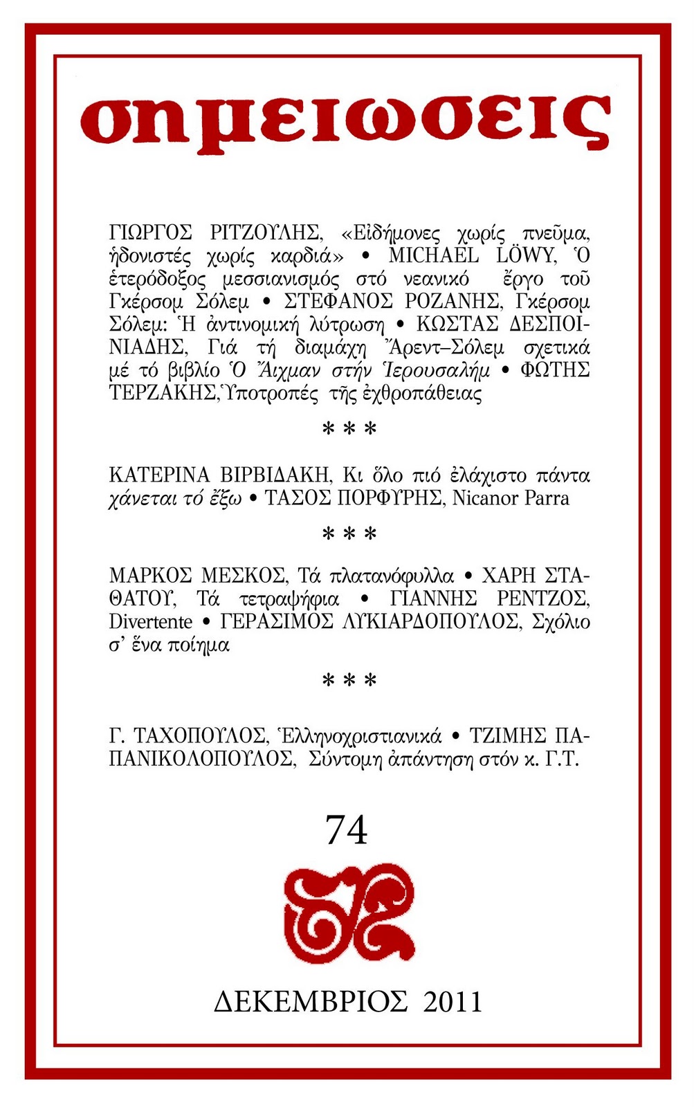 Δεν ξέρω αν πρόκειται για πείσμα ή όχι, πάντως οι “Σημειώσεις”, μια περιοδική έκδοση που ξεκίνησε την πορεία της πριν από 37 χρόνια, ως μια συλλογική έκφραση ανοιχτής πολιτικής και πολισμικής ματιάς συνεχίζει τις άτακτες εμφανίσεις της μέχρι τις μέρες μας, με… τακτικές πάντοτε συνεργασίες. Τριανταεφτά χρόνια ιστορίας λοιπόν με 72 τεύχη εν συνόλω. Πιο πρόσφατο αυτό του περασμένου Νοέμβρη απ’ όπου και αποσπάσαμε «αυθαίρετα» το κείμενο του Γεράσιμου Λυκιαρδόπουλου το οποίο δημοσιεύουμε στις παράπλευρες στήλες. Εκτός από το κείμενο αυτό, στο πρόσφατο τεύχος των «σημειώσεων» θα βρείτε ακόμη: κείμενο του Στέφανου Ροζάνη «περί συμβόλων» των Βασίλη Αλεξίου και Παν. Καραγιάννη για τα όρια της μεταφοράς και τις μεταφορές των ορίων, κείμενο του Γιώργου Παπαπαναγιώτου για τον Αντον Πάνενουκ αλλά και του ίδιου του Πάννενουκ με τίτλο «Γιατί απέτυχαν τα προηγούμενα επαναστατικά κινήματα». Τέλος θα βρείτε ένα σημείο συνάντησης του Φρανσουά Βιγιόν με τον δικό μας Μάρκο Μέσκο μέσα από «ποιητικό» πόνημα του δεύτερο που τιτλοφορείται «Οι κλοσάρ των Βοδενών». Αναζητείστε το τεύχος στα κεντρικά βιβλιοπωλεία της πόλης, αξίζει τον κόπο!.