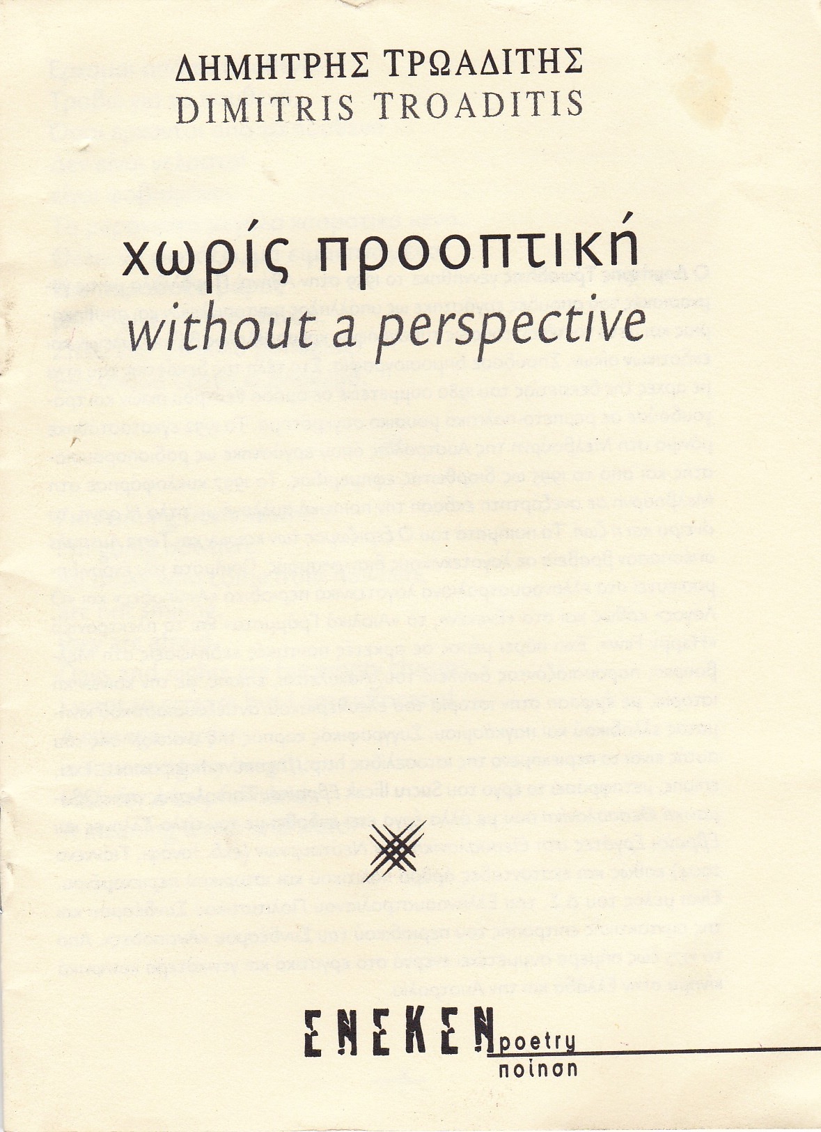 Δημήτρης Τρωαδίτης, Εξώφυλλα Posted by Το κόσκινο on June 19, 2013 Η οργή, το όνειρο και η ζωή, Ιούλης 1997, Ανεξάρτητη έκδοση Χωρίς προοπτική / Without a perspective, εκδ. Ένεκεν Η μοναξιά του χρόνου, εκδ. Το Κόσκινο Share this: Share on X (Opens in new window) X Share on Facebook (Opens in new window) Facebook Like Loading... Related