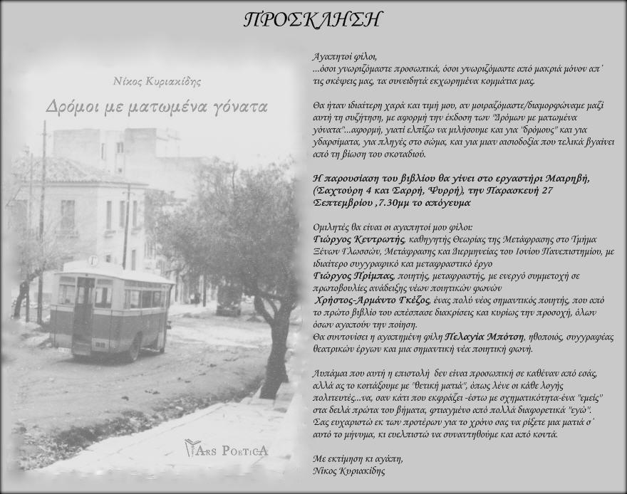 Πρόσκληση για μια συνάντησή μας – παρουσίαση της ποιητικής συλλογής “Δρόμοι με ματωμένα γόνατα” του Νίκου Κυριακίδη Posted by Το κόσκινο on September 20, 2013 Share this: Share on X (Opens in new window) X Share on Facebook (Opens in new window) Facebook Like Loading... Related