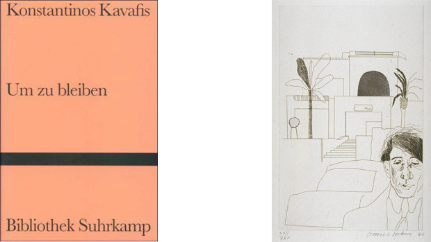 Θα σταθώ σε μια έκδοση των ερωτικών ποιημάτων του από τον εκδοτικό οίκο Suhrkamp. Είναι μια έκδοση που περιέχει τα καλύτερα ερωτικά ποιήματα του Αλεξανδρινού ποιητή συνοδευμένα από 13 χαρακτικά του David Hockney. Μια φροντισμένη έκδοση, με σκληρό εξώφυλλο που μαζί με τις δημιουργίες του Hockney το καθιστούν ένα πραγματικό έργο τέχνης. Ο David Hockney γεννήθηκε στις 9 Ιουλίου του 1937.
