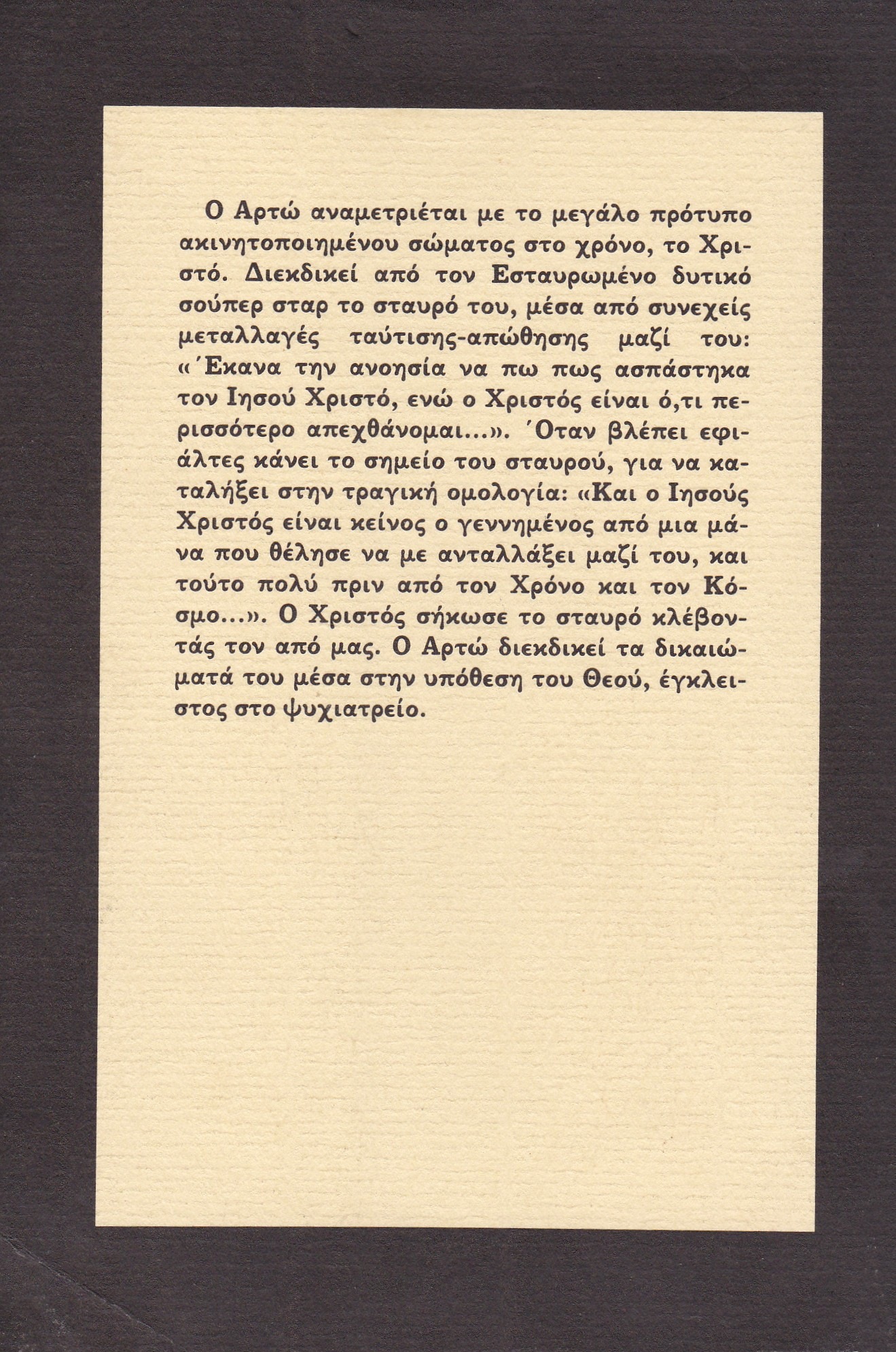 προσπάθησαν να προσδώσουν σ’ αυτό το κενό που αποκαλούμε πνευματική κατάσταση, στον ευνουχισμό του σώματός τους, αρσενικού ή θηλυκού, στην αδυναμία τους να αναγνωρίσουν ο,τιδήποτε έχει ζωή