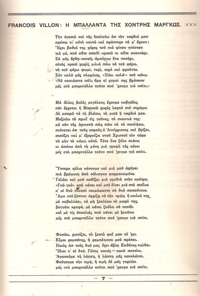 Francois Villon, Η Μπαλλάντα της Χοντρής Μαργκώς Posted by Το κόσκινο on November 26, 2013 *«Η Μπαλλάντα της Χοντρής Μαργκώς», του Φρανσουά Βιγιόν, σε μετάφραση Λευτέρη Αλεξίου, δημοσιεύτηκε στο «Το Κάστρο» – περιοδική έκδοση Στίχου και Κριτικής, αρ. φύλλου 1, Μάης 1934. Share this: Share on X (Opens in new window) X Share on Facebook (Opens in new window) Facebook Like Loading... Related