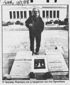 Στη φωτογραφία, από δημοσίευμα της εφημερίδας “Τα Νέα” στις 12 Μάρτη 1988, ο Αργύρης Μαρνέρος πουλάει βιβλία του στα Προπύλαια.
