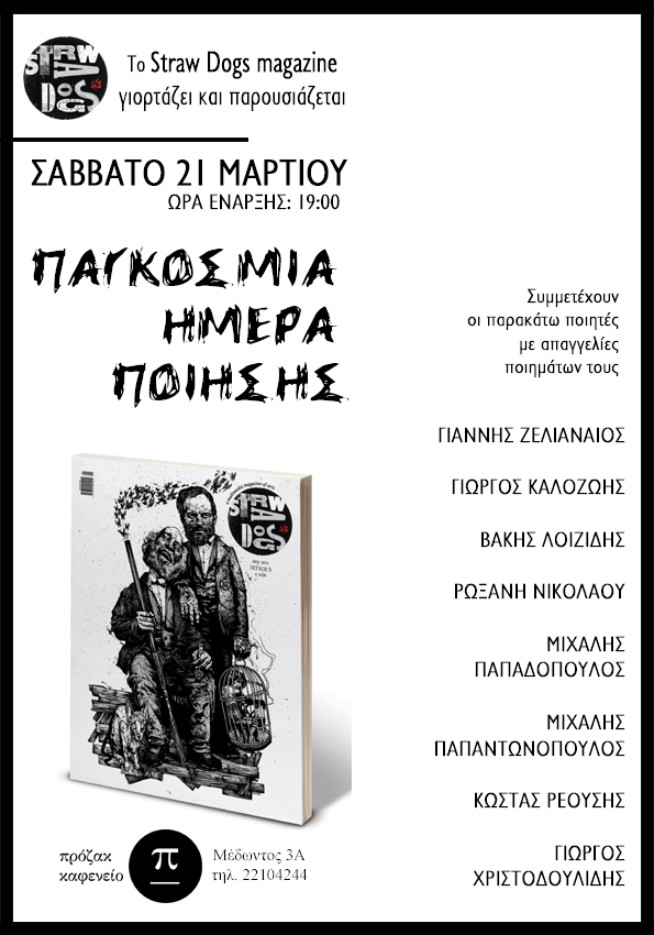 Το περιοδικό και οι εκδόσεις Straw Dogs γιορτάζουν την Παγκόσμια Ημέρα Ποίησης το Σάββατο 21 Μαρτίου και ώρα 19:00 στο καφενείο – αναγνωστήριο πρόζακ (Μέδωντος 3Α, Λευκωσία).