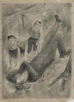 Τάτλιν Βλαντιμίρ, “Εικονογραφικό προσχέδιο για το βιβλίο ” Vo-Pervykh I Vo-Vtorykh” του Daniil Kharms” (1929). Ασπρόμαυρο σχέδιο που απεικονίζει υπαίθρια σκηνή με μια ανδρική και τρεις παιδικές μορφές.