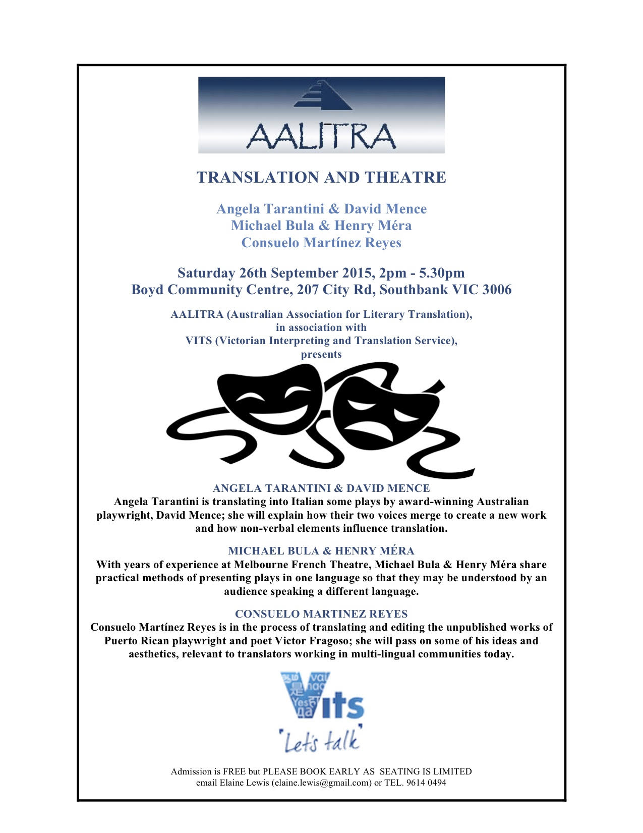 AALITRA – Translation and Theatre Posted by Το κόσκινο on September 11, 2015 Share this: Share on X (Opens in new window) X Share on Facebook (Opens in new window) Facebook Like Loading... Related