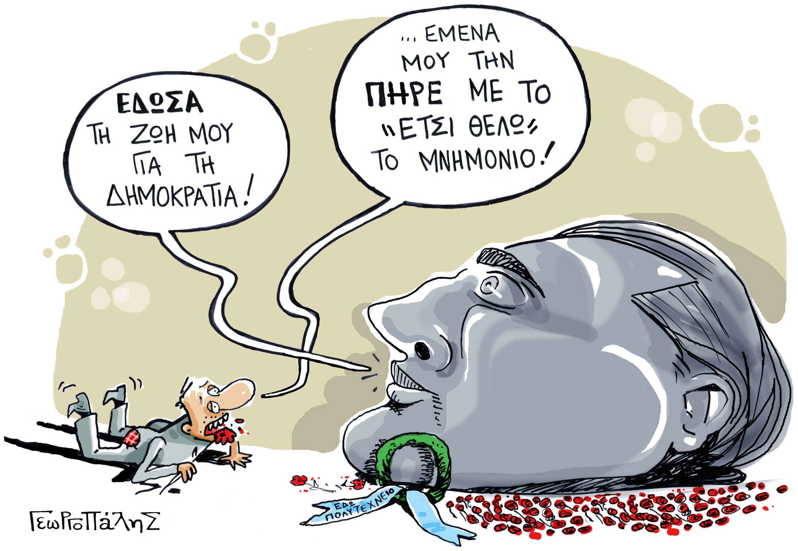 Το σκίτσο είναι του Δημήτρη Γεωργοπάλη (http://www.aksioprepeiakantoxh.com/thematikes/istoria/1598-17-noemvriou-2014-i-epeteios-tou-polytexneiou-se-skitsa)