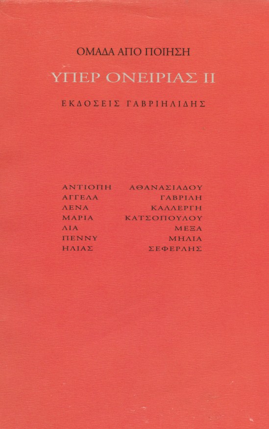 *Από το βιβλίο “Υπέρ Ονειρίας ΙΙ”, της Ομάδας Από Ποίηση, εκδ. Γαβριηλίδης, 2012. Στον τόμο αυτό συμμετείχαν οι ποιητές Αντιόπη Αθανασιάδου, Αγγέλα Γαβρίλη, Λένα Καλλέργη, Μαρία Κατσοπούλου, Λία Μέξα, Πέννυ Μηλιά και Ηλίας Σεφερλής.