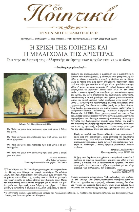 “The Crisis of Poetry and the Melancholy of the Left,” a study, solicited by the distinguished Greek quarterly Poetics, of the new Greek poetry based on several essays on the same topic that have been appearing in this blog.