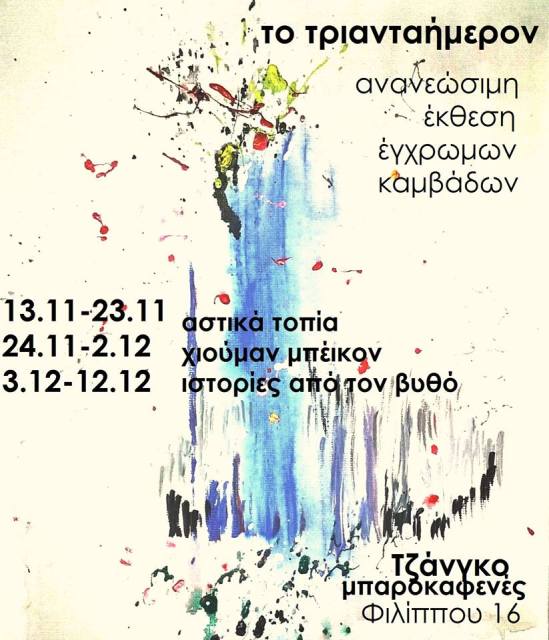 Το Τριανταήμερον – Ανανεώσιμη Έκθεση Έγχρωμων Καμβάδων Posted by Το κόσκινο on November 12, 2017 Share this: Click to share on X (Opens in new window) X Click to share on Facebook (Opens in new window) Facebook Like Loading... Related