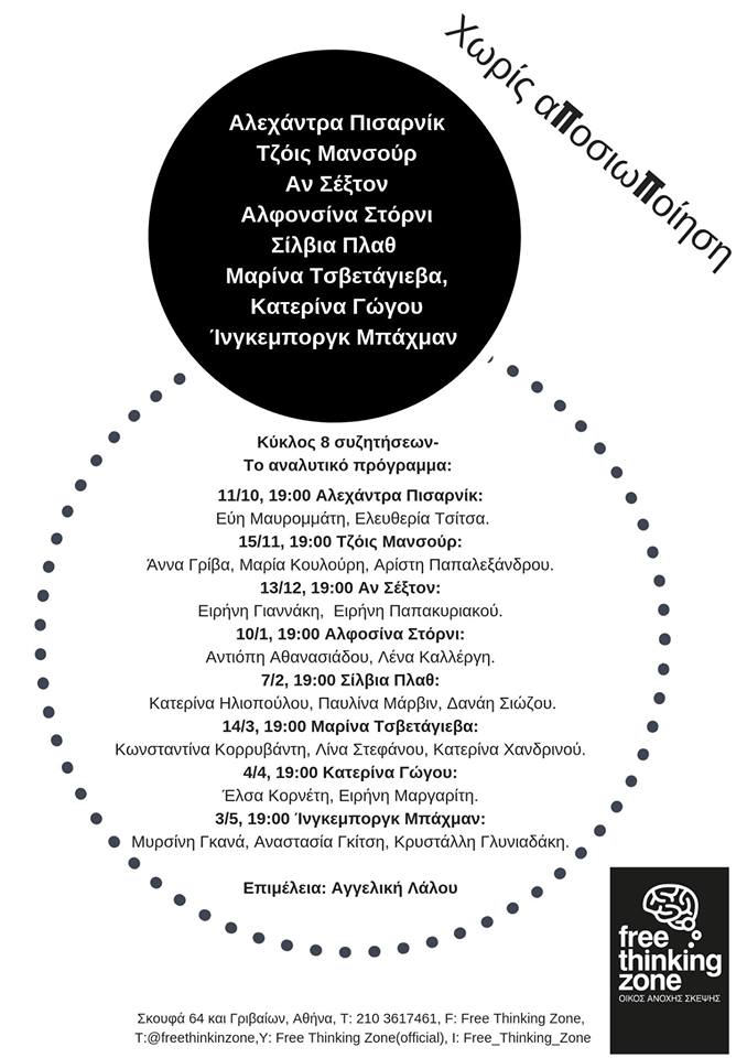 afisa ftz Published October 6, 2018 at 678 × 960 in ΧΩΡΙΣ ΑΠΟΣΙΩΠΟΙΗΣΗ – Αλεχάντρα Πισάρνικ, Τζόις Μανσούρ, Αν Σέξτον, Αλφονσίνα Στόρνι, Σίλβια Πλαθ, Μαρίνα Τσβετάγιεβα, Κατερίνα Γώγου, Ίνγκεμποργκ Μπάχμαν