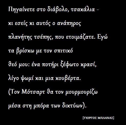 Γιώργος Μπλάνας, Πηγαίνετε στο διάβολο, τσακάλια… Posted by Το κόσκινο on April 10, 2020 Share this: Click to share on X (Opens in new window) X Click to share on Facebook (Opens in new window) Facebook Like Loading... Related