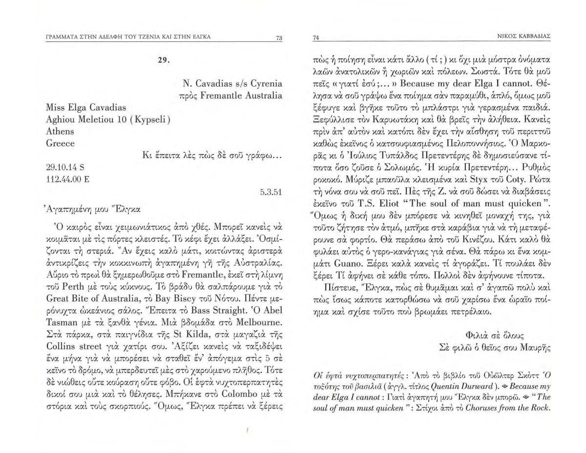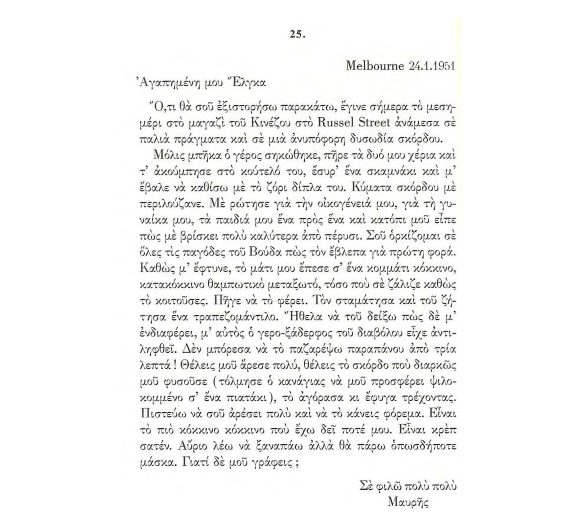Το ελληνοαυστραλιανό ενδιαφέρον της υπόθεσης είναι ότι η Έλγκα ήταν αποδέκτης επιστολών από τον θείο της, Νίκο Καββαδία, όταν αυτός ήταν εν πλω. Σε βιβλίο που εκδόθηκε από τις Εκδόσεις «Άγρα», με τίτλο «Νίκος Καββαδίας, Γράμματα στην αδελφή του Τζένια και στην Έλγκα», περιλαμβάνονται και δύο επιστολές του Νίκου, που στάλθηκαν μία από το Φριμάντλ της Δυτικής Αυστραλίας και μία από τη Μελβούρνη, το 1951.