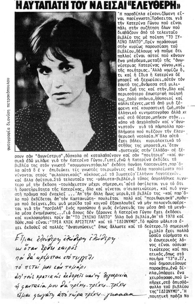 Ένα “προφητικό” κείμενο για το βιβλίο “Το ξύλινο παλτό” της Κατερίνας Γώγου, που είχε δημοσιευτεί στο περιοδικό “διάβασε για να διαβασεις…”, τεύχος 4, Φλεβάρης 1983 (μετά από δέκα χρόνια “έφυγε” η Κατερίνα!). Ήταν μια τριμηνιαία έκδοση (1982-84) του Λεωνίδα Χρηστάκη, με “δεκάδες πληροφορίες για εκδόσεις βιβλίων, περιοδικών” και άλλα πολλά…