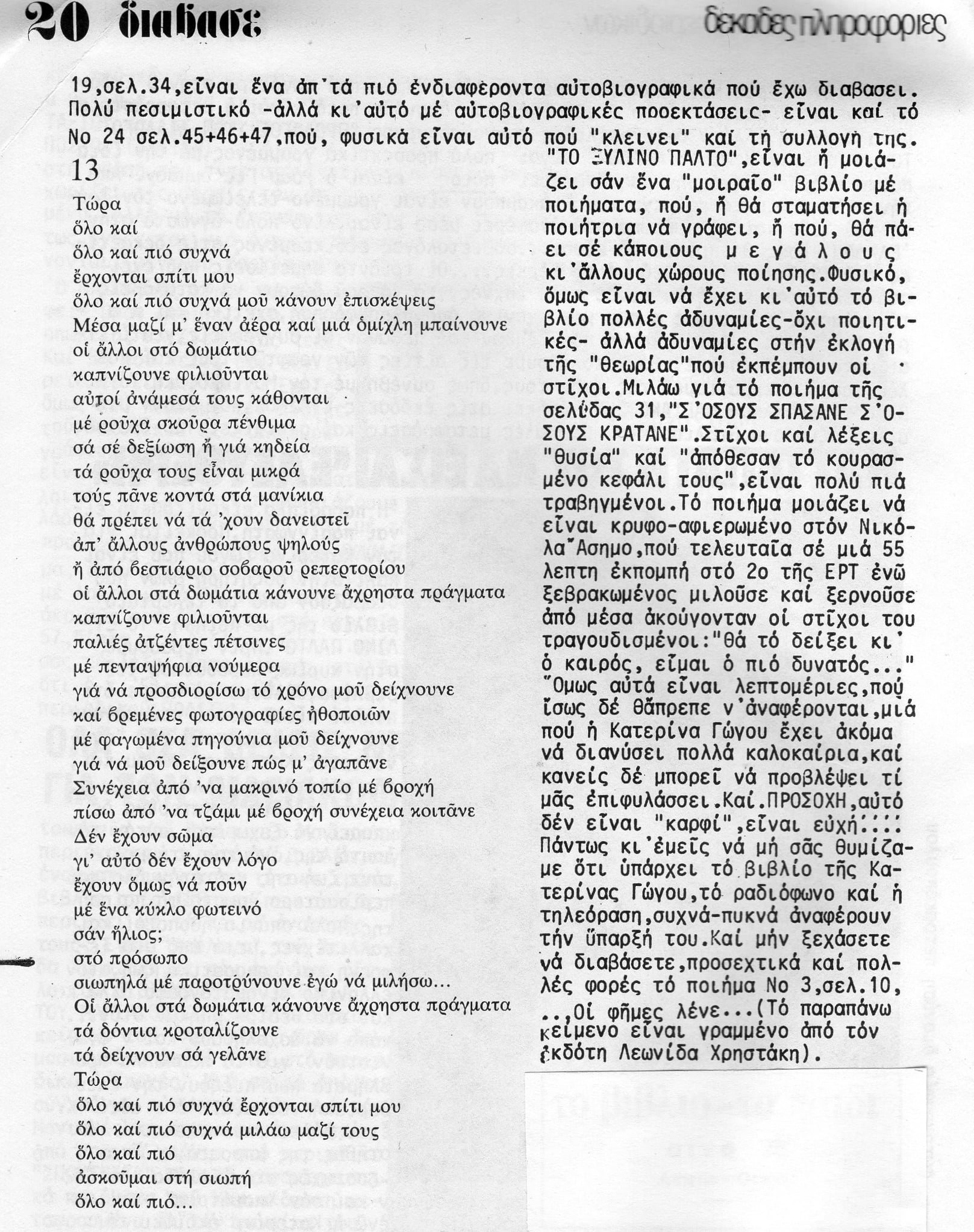 Ένα “προφητικό” κείμενο για το βιβλίο “Το ξύλινο παλτό” της Κατερίνας Γώγου, που είχε δημοσιευτεί στο περιοδικό “διάβασε για να διαβασεις…”, τεύχος 4, Φλεβάρης 1983 (μετά από δέκα χρόνια “έφυγε” η Κατερίνα!). Ήταν μια τριμηνιαία έκδοση (1982-84) του Λεωνίδα Χρηστάκη, με “δεκάδες πληροφορίες για εκδόσεις βιβλίων, περιοδικών” και άλλα πολλά…
