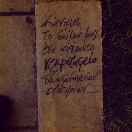 Ο δρόμος και μία κουβέρτα σπίτι του-Λείπει απ’ τη θέση του-Να ζητιανέψει μες στη θλίψη του-Στη διπλανή γωνία-Που καφετέριες και μαγαζιά-Το πλήθος προσπερνά με αδιαφορία-Μα ένα κορίτσι σταματά-Τυρόπιτες αφήνει στην κουβέρτα-Πλακώνουν περιστέρια–Τις τρώνε φρενιασμένα-Κι αυτός-Που ο δρόμος και μια κουβέρτα σπίτι του-Μ’ όλη τη θλίψη του-Επιστρέφει απ’ τη διπλανή γωνία-Βρίσκει τα φαγωμένα περιστέρια-Και με τα μάτια ευτυχισμένα-Τρώει τα ψίχουλα-Το πλήθος προσπερνά με αδιαφορία-