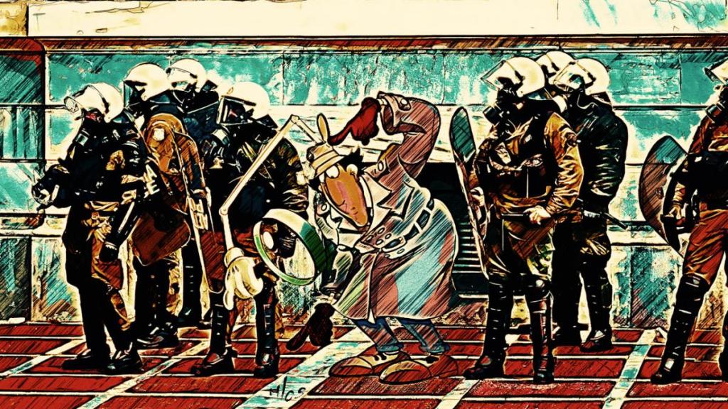 «Λυπάμαι αλλά θα πρέπει να σου βάλω πρόστιμο 150 ευρώ», λέει ο αστυνομικός. «Τι πράγμα; ΕΣΥ μου ζητάς λεφτά ΕΜΕΝΑ;» «Ναι, ναι. Γιατί είσαι εδώ χωρίς άδεια.» «Α, χρειάζεσαι χαρτιά. Χαρτιά, ε; Θα σου δείξω μερικά κωλόχαρτα!» Ο Δημήτρης αρχίζει να σκίζει τις παλιές εφημερίδες από τα ράφια του εγκαταλελειμμένου περιπτέρου. Τις πετάει στον νεαρό μία μία. «Χαρτιά, είπες. Ορίστε τα χαρτιά σου, παλιοκάθαρμα! Είναι αρκετά για σένα; Άδεια για να είμαι έξω, λες. Οικογένεια, ε; Οικογένεια! Οικογένεια είπε το κάθαρμα!» Ο Δημήτρης συνεχίζει να σκίζει τις εφημερίδες από τα ράφια. Ο νεαρός ρίχνει μια γρήγορη ματιά γύρω του προτού το βάλει στα πόδια, καθώς ένας καταιγισμός εφημερίδων εκσφενδονίζεται προς το μέρος του.